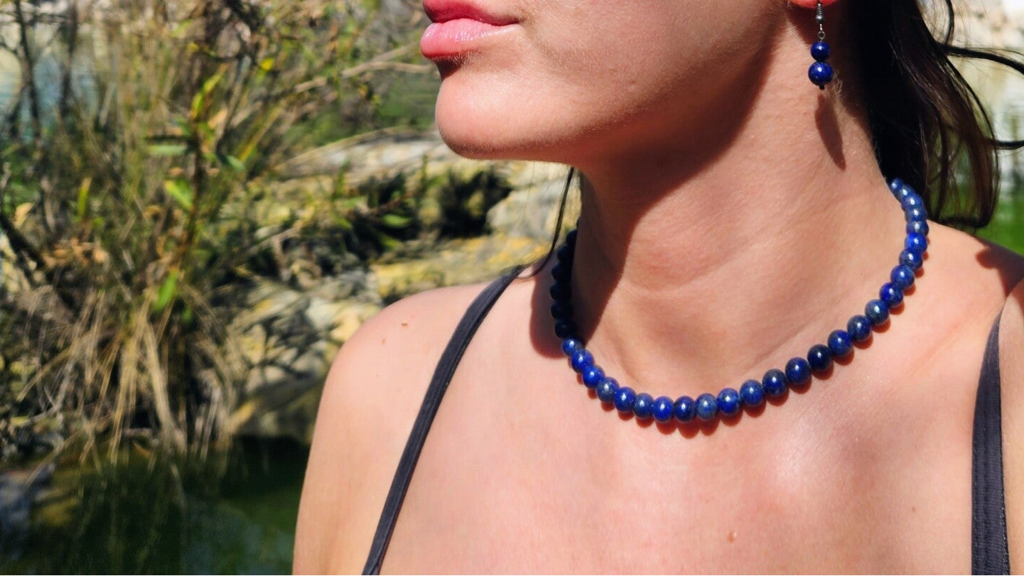 Ten wyjątkowy zestaw biżuterii obejmuje naszyjnik, bransoletkę i kolczyki, wykonane z naturalnych, okrągłych kamieni lapis lazuli. Głęboki, królewski odcień niebieskiego z delikatnymi złocistymi refleksami nadaje biżuterii niepowtarzalny charakter i elegancję.